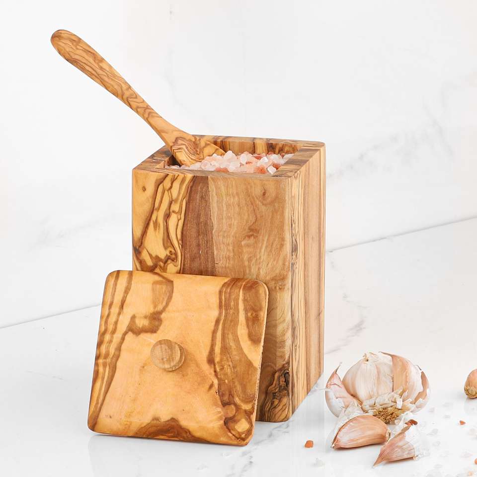 Handmade Olive Wood Spice Jar with Lid and Spoon Rustic Olive Wood Kitchen Storage High-Quality Eco-Friendly Kitchen Accessory