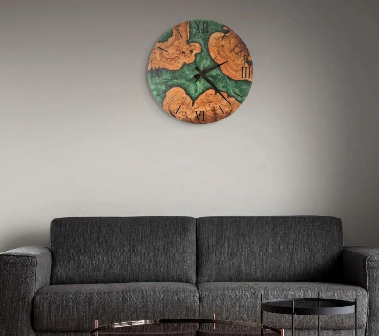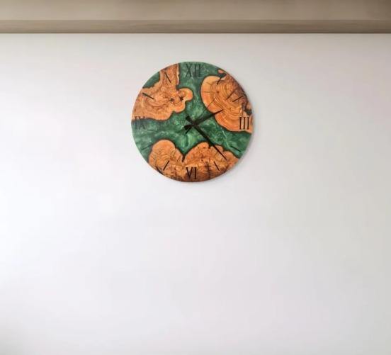Handmade Olive Wood Wall Clock Green Epoxy Resin Botanical Home Decor At cheap Price