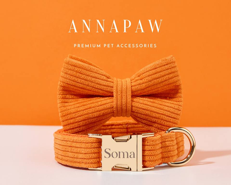 Handmade Orange Corduroy Tactical Bow Tie Set with Plastic Leash-Custom Dog Collar & Leash Free Engraved Name for Birthday Gift