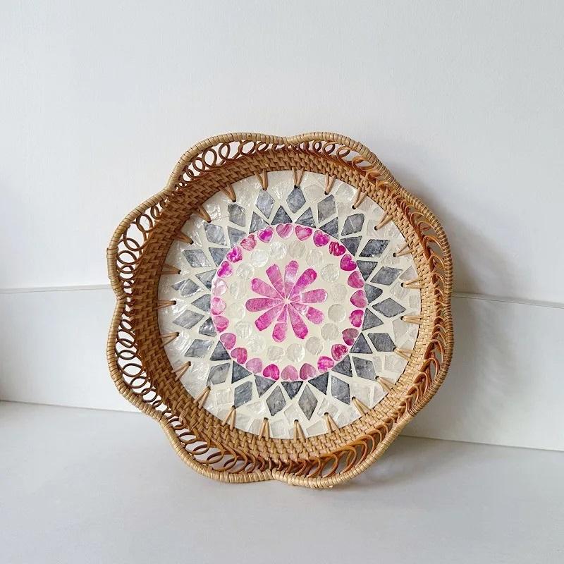 Handmade Oval Fruit Bread Storage Rattan Basket Tray Woven Wicker Serving Inlay Nacre Mother Pearl Decorative Woven Basket