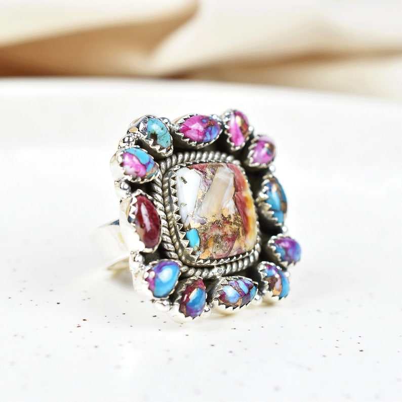 Handmade Pink Dahlia Turquoise Oval Cut Bezel Setting Sterling Silver Adjustable Statement Ring for Wedding & Party