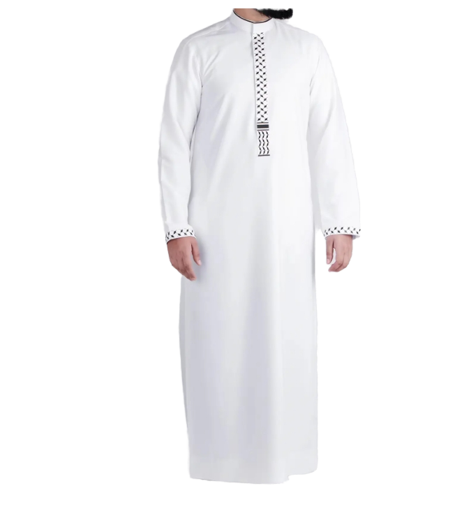 Handmade Polyester Embroidery White Arab Thobe Palestine Jubba for Men Long Sleeve Ankle Length