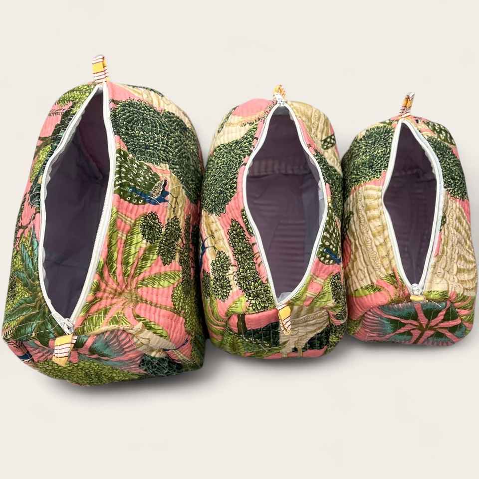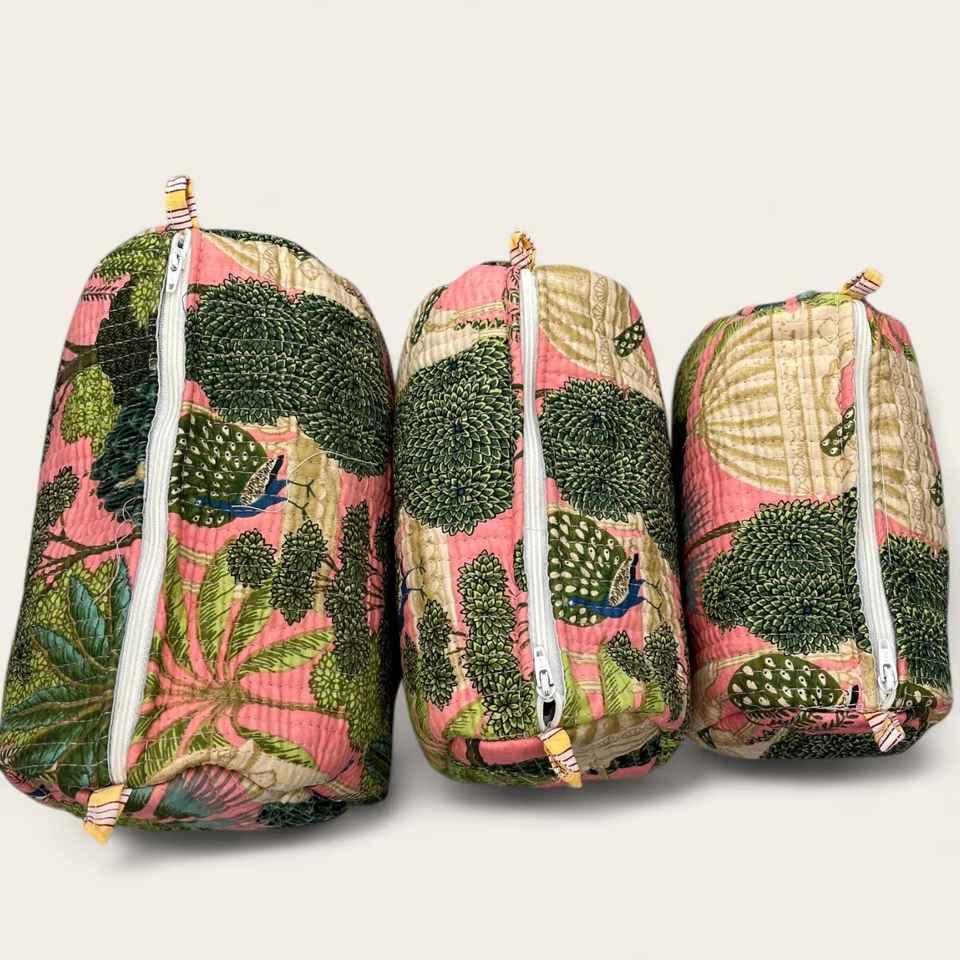 Handmade Quilted Cotton Cosmetic Bag Set 3pc Waterproof Floral Print Travel Toiletry Organizer