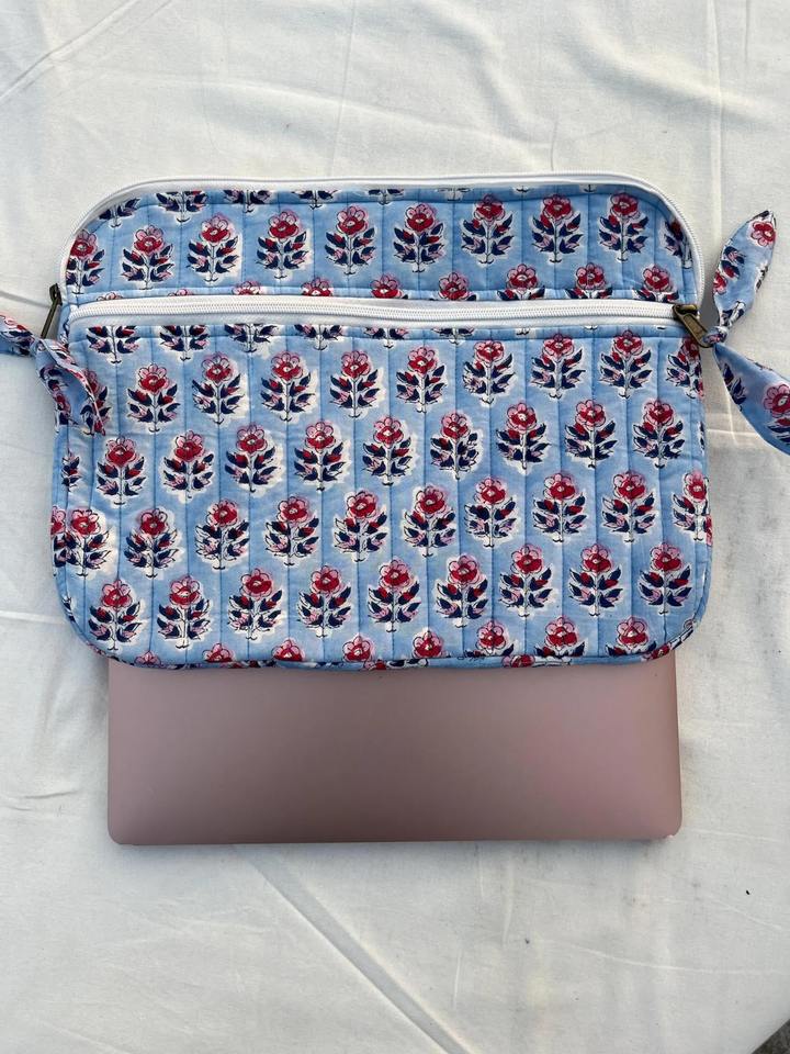 Handmade Quilted Cotton Laptop Sleeve Blue Floral Block Print Eco-Friendly Durable Lightweight Business Modern Vintage Simple