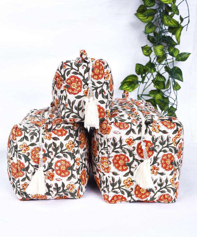 Handmade Quilted Eco-Friendly Cotton Cosmetic Case Set Indian Block Print Zipper Water Resistant Large Capacity for Makeup