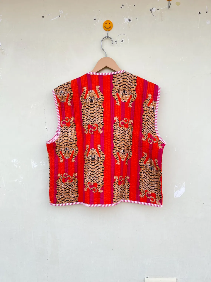 Handmade Quilted Sleeveless V-Neck Jacket for Women Red Block Tiger Print Cotton Filled Winter Autumn Season Long Length Coat