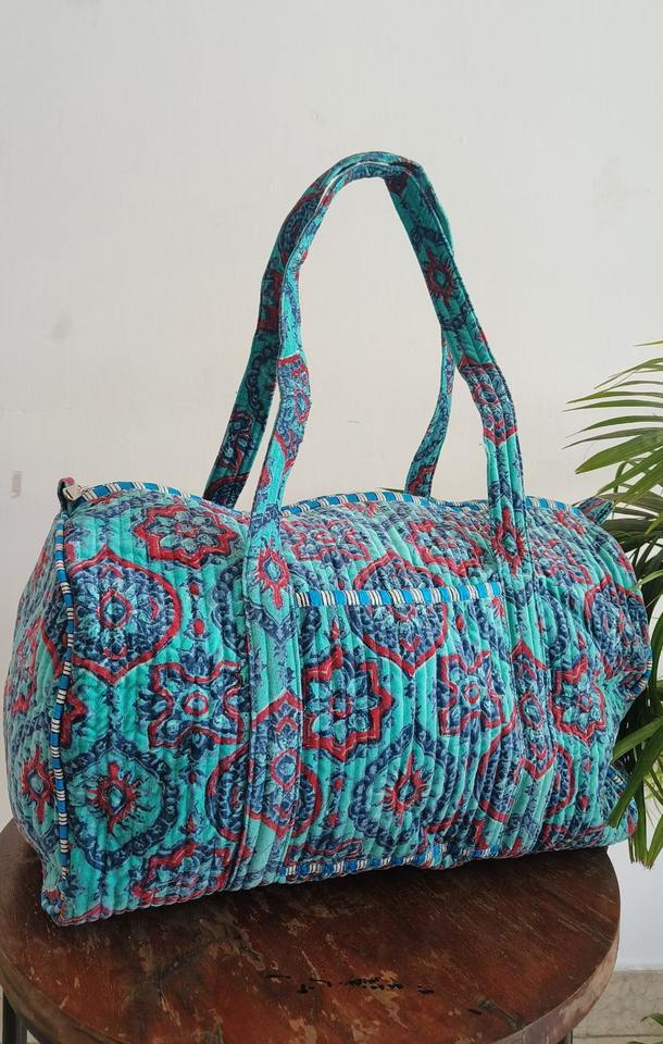 Handmade Quilted Velvet Cotton Duffle Bag Blue Red Floral Print | Luxury Weekender Durable Travel Bag | Eco-Friendly Large