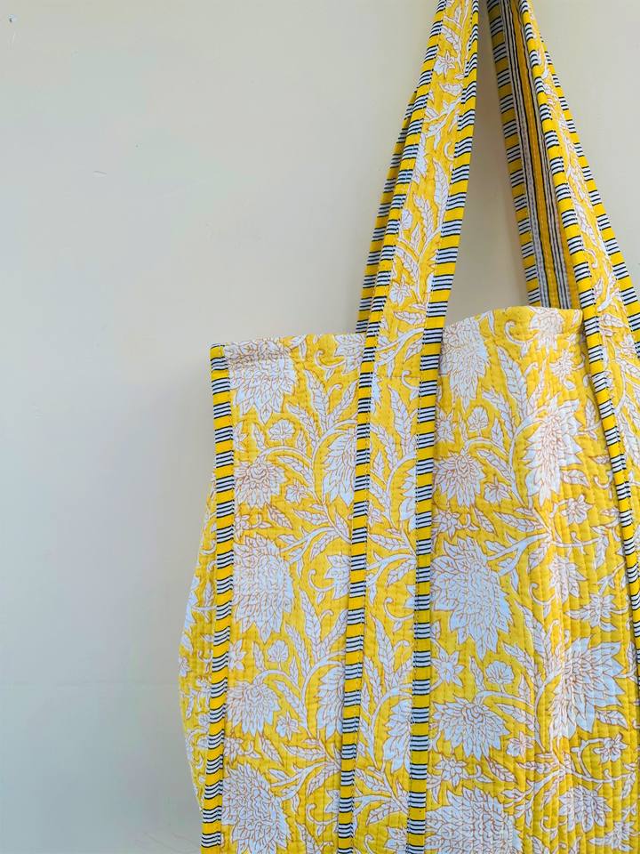Handmade Quilted Women's Tote Bag Indian Cotton Fabric with Embroidery & Chains Decor Open Closure