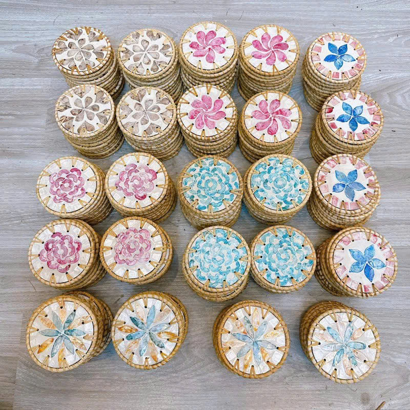 Handmade Rattan Woven Coaster Set Round Drink Coasters Eco Friendly Table Decor Classic Flower Pattern Holiday Gift Made Vietnam