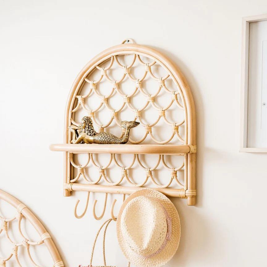 Handmade Rattan Wall Shelf with Hanging Hook for Home Decor in Living Room Garage or As Jewelry Display Multi-Purpose Use