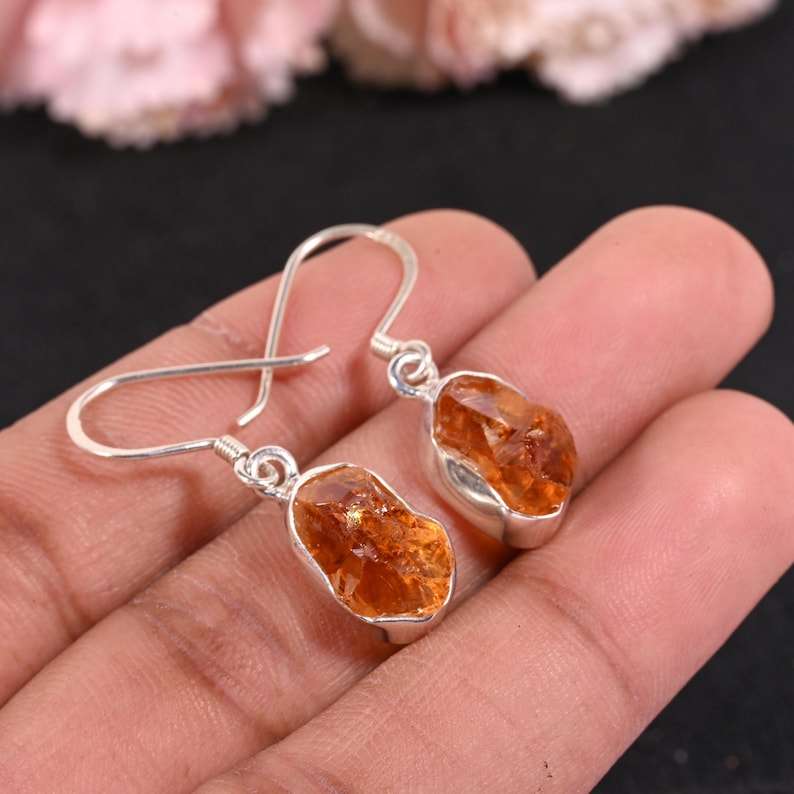 Handmade Raw Citrine Earrings Sterling Silver Natural Crystal Dangle November Birthstone