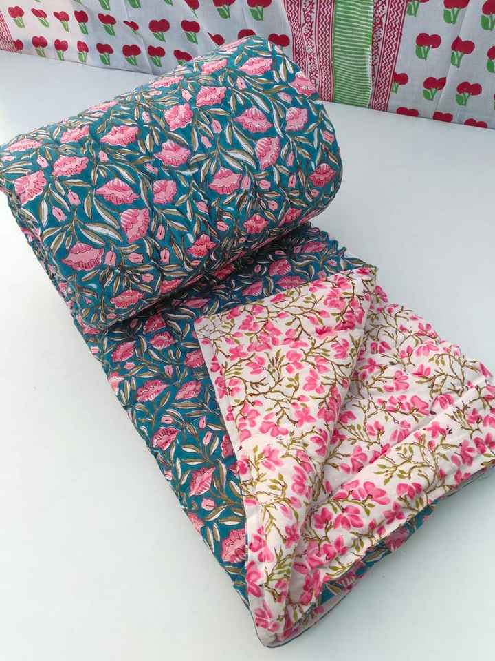 Handmade Razai Quilt Blockprint Bedspread Cozy Throw Blanket Bedding Bedroom Home Textile