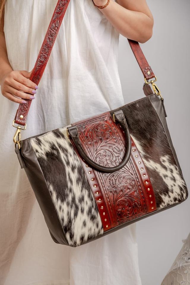 Handmade Real Cowhide Tooled Leather Tote Bag Women Handbag Fashionable High Quality Tooled Sopping Bag