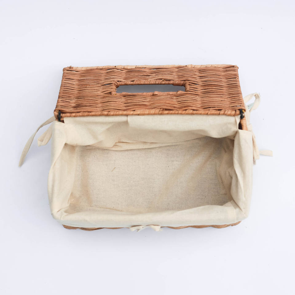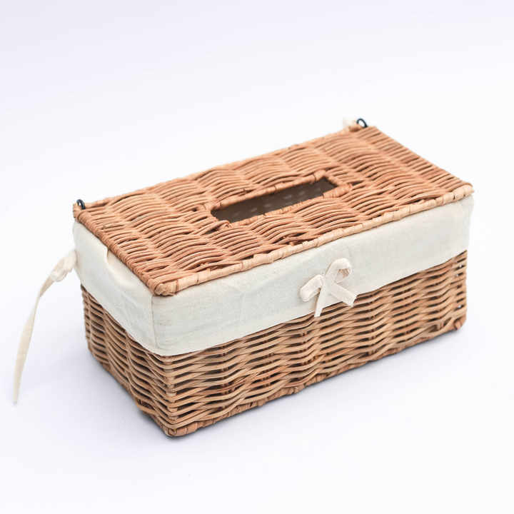 Handmade Rectangular Bamboo and Rattan Tissue Box – Canvas Lining with Bow Tie, Vintage/Rustic Style