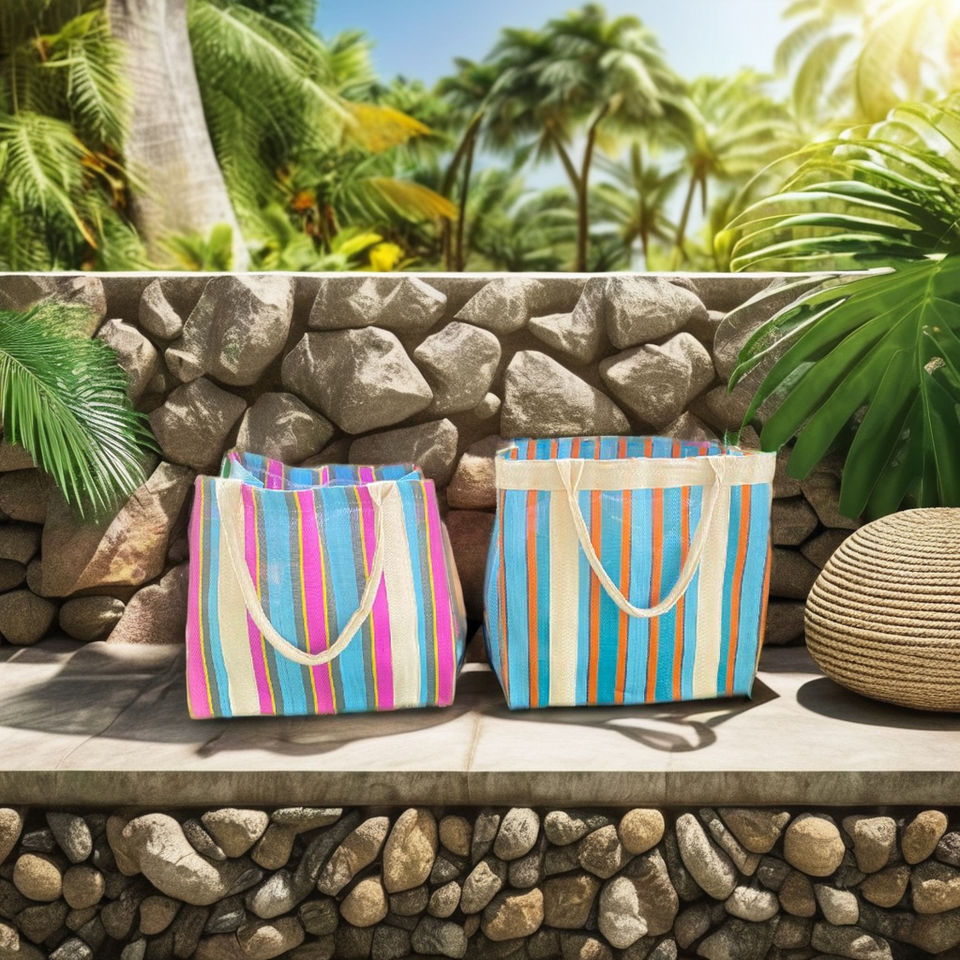 Handmade Recycled Nylon Beach Bags Woven Striped Pattern Unique Indian Traditional Style Reusable Zipper Top Eco-friendly