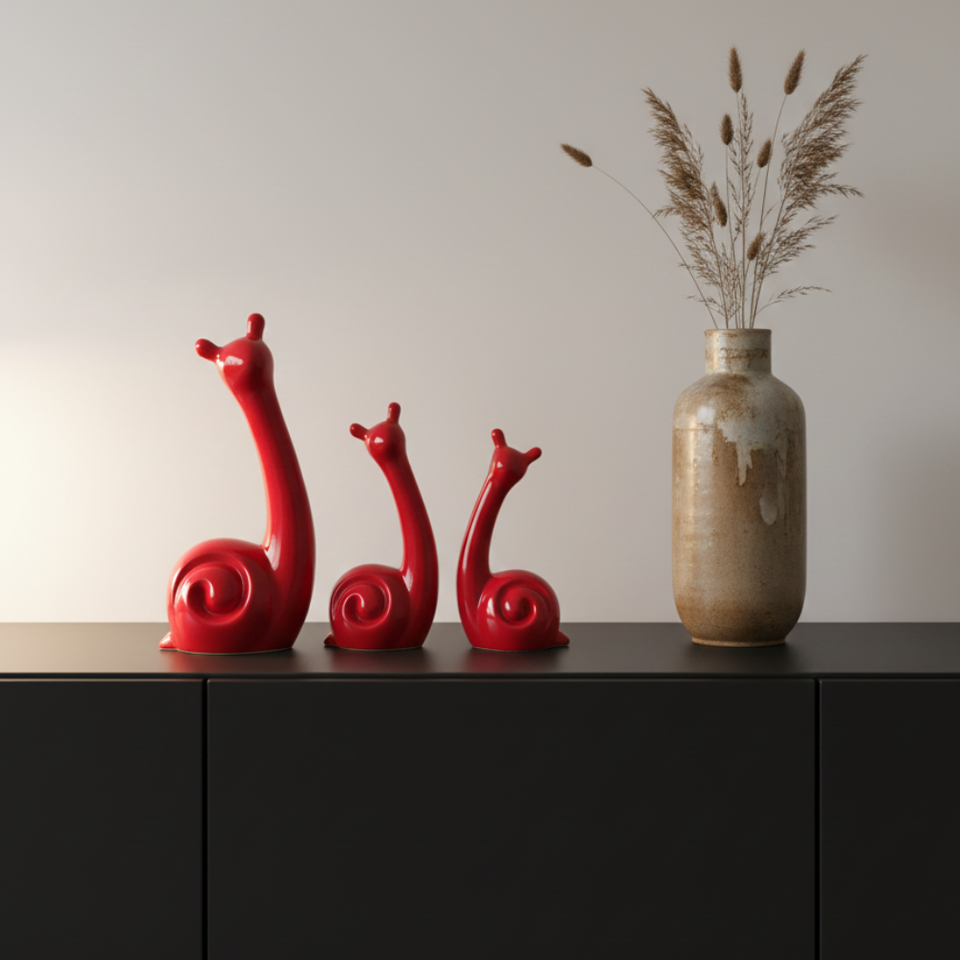 Handmade Red Ceramic Animal Snail Figurine Set Glossy Artisanal Eco-Friendly Indian Home Decor Accent Trio Modern Minimal Shelf