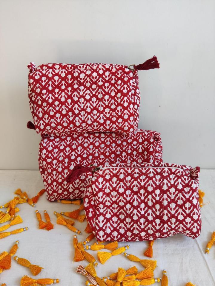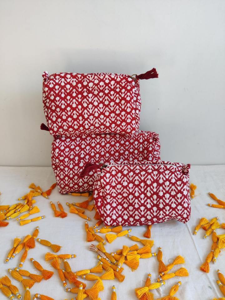 Handmade Red Eco-friendly Cotton Large Capacity Makeup Case Block Print with Zipper Closure for and Travel Storage