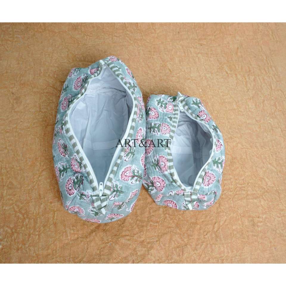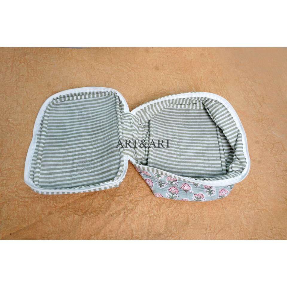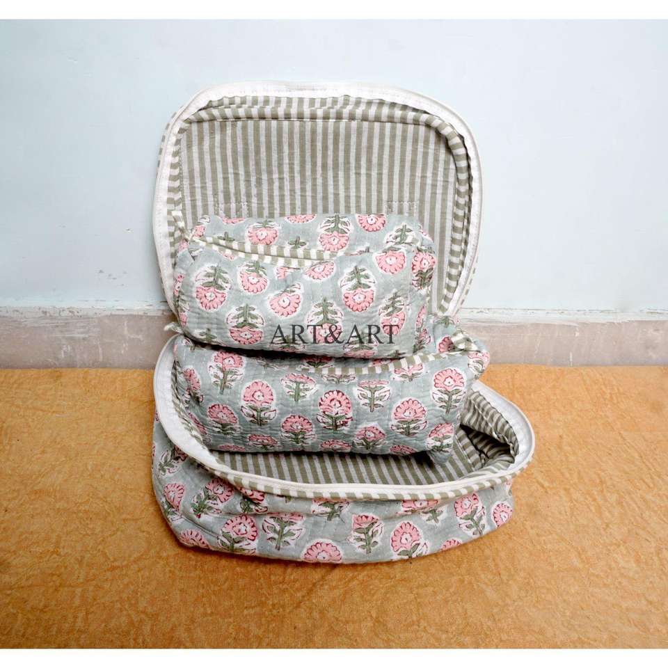 Handmade Reusable 3-Piece Large Multifunction Vanity Case Zipper Set Sustainable Indian White Diagonal Stripe Block Printed