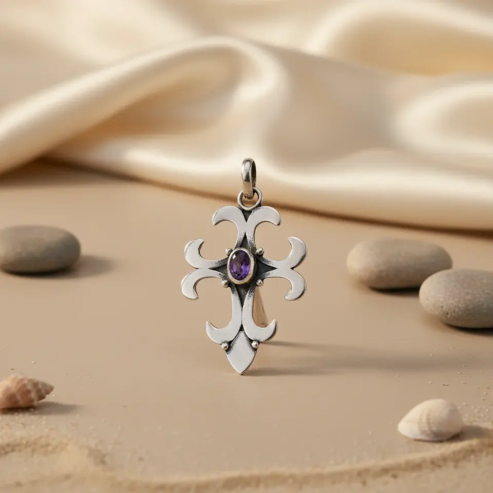 "Handmade Rose Gold Amethyst Cross Charm Pendant for Women-925 Silver Platinum Jewelry"