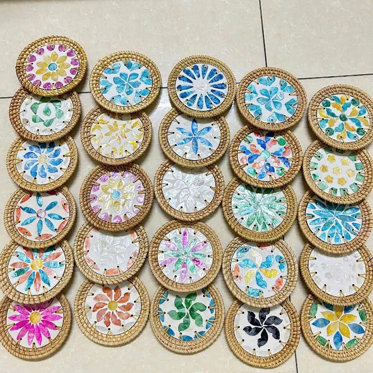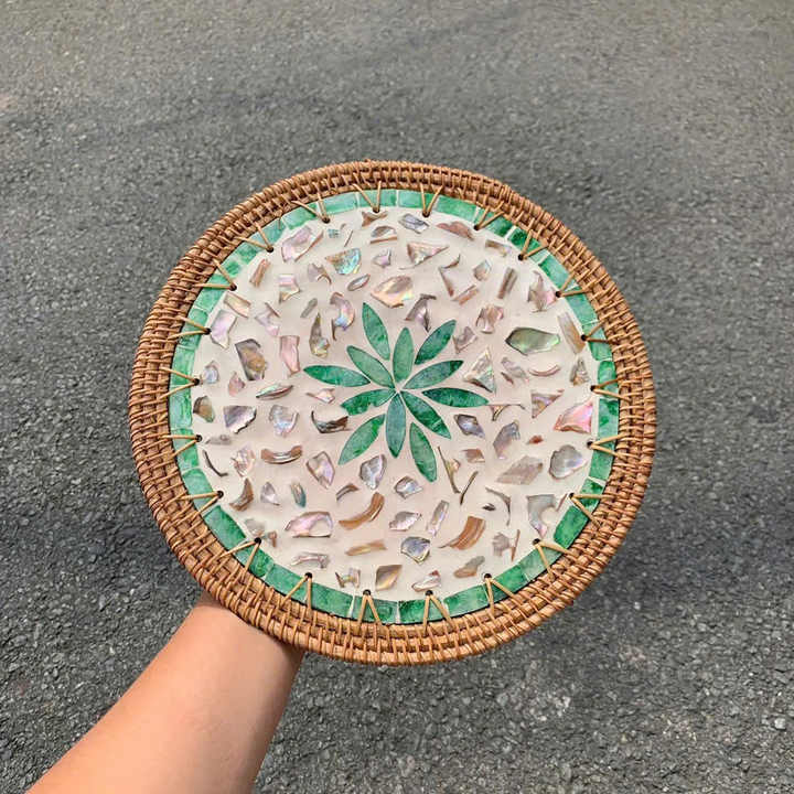 Handmade Round Rattan Placemat Featuring Mother of Pearl Shell Mosaic Direct Factory Wholesale Custom Logo Vietnam