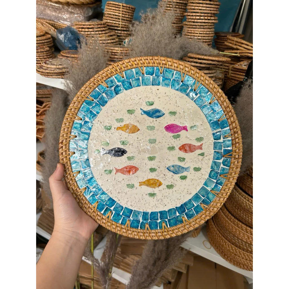 Handmade Round Rattan Placemat with Premium Mother of Pearl Raw Shell Mosaic Direct Factory Wholesale Custom Logo Vietnam