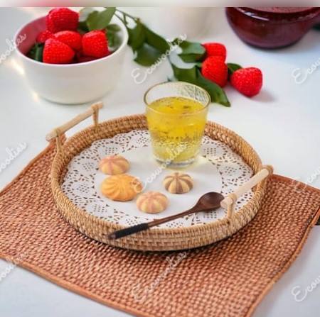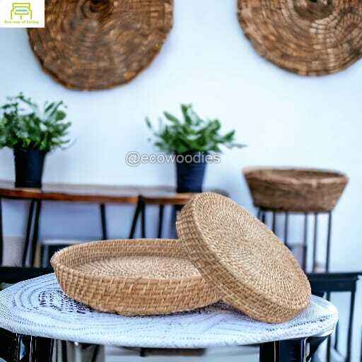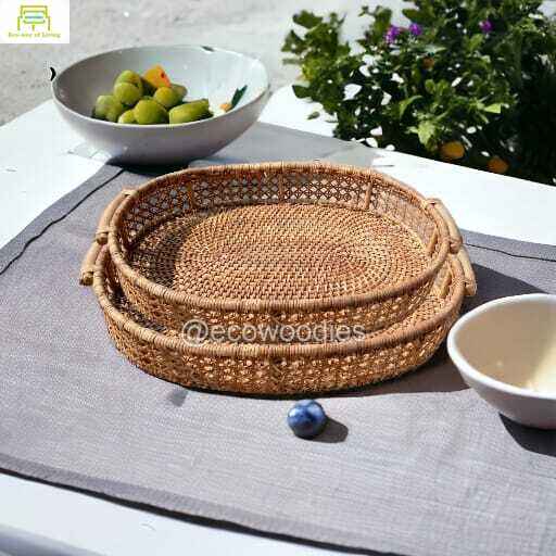 Handmade Round Woven PP Rattan Woven Baskets Tray With Handle Tea Table Snack Fruit Plate Living Room Household Rattan Tray