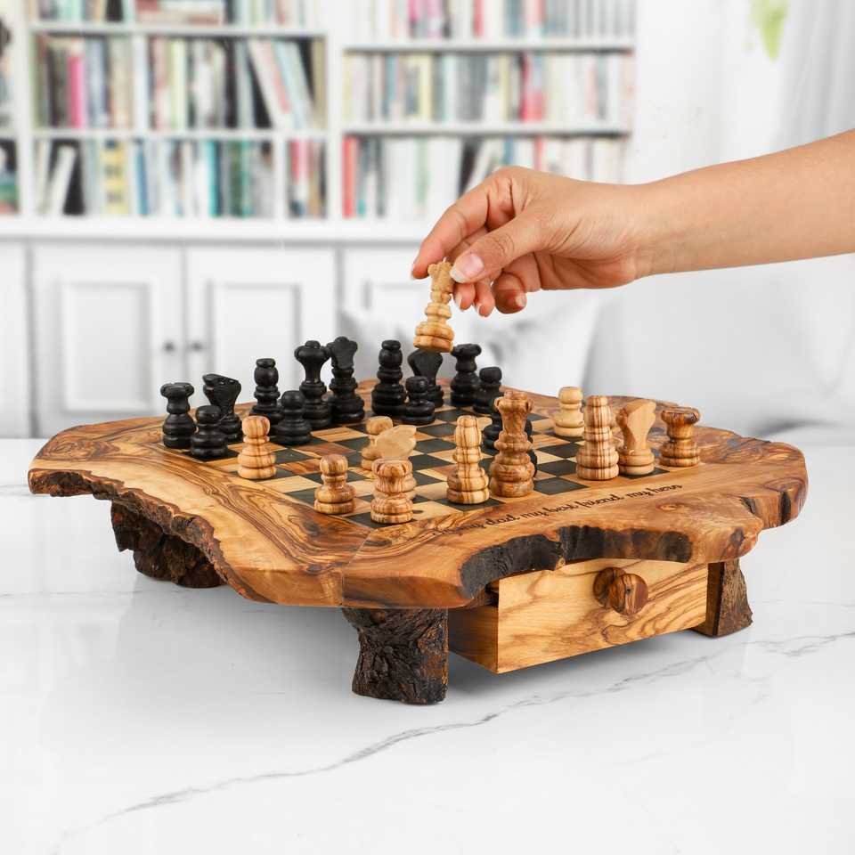 Handmade Rustic Wooden Chess Set Board Game with Convenient Storage Solution