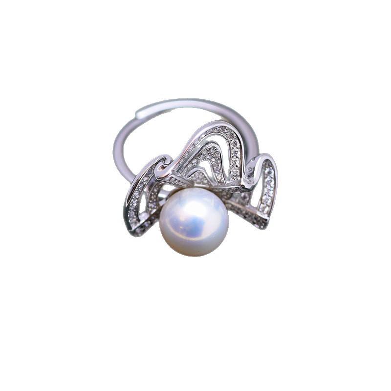 Wenchi Handmade S925 Silver Freshwater Pearl Ring 9-10mm Round White Pearl Strong Light & Fine Flaws Ribbon Style for Women