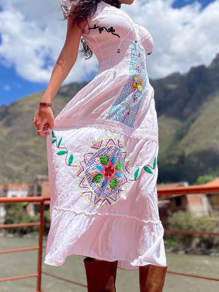 Handmade Shipibo White Dress Embroidered Ceremonial Dress Ethnic Festival Outfit Women Traditional Wear