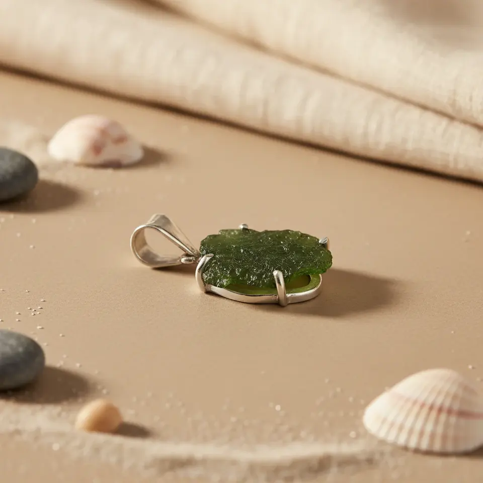 Handmade Silver Moldavite Pendant Necklace with Green Gemstone Rhodium Plated Religious Charm Diamond Main Stone Jewelry