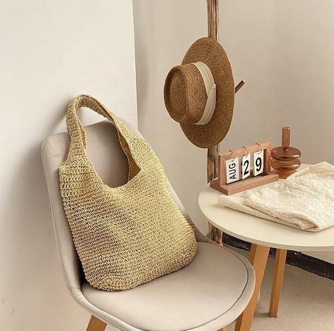 Handmade Simple Plain Women's Straw Tote Bag New Wild Style Woven Shoulder Woven Bag with Zipper Closure for Summer and Autumn