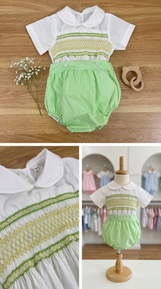 Handmade Smocked Baby Romper Set with Peter Pan Collar, White Cotton Shirt and Green Bloomer, Boutique Toddler Outfit