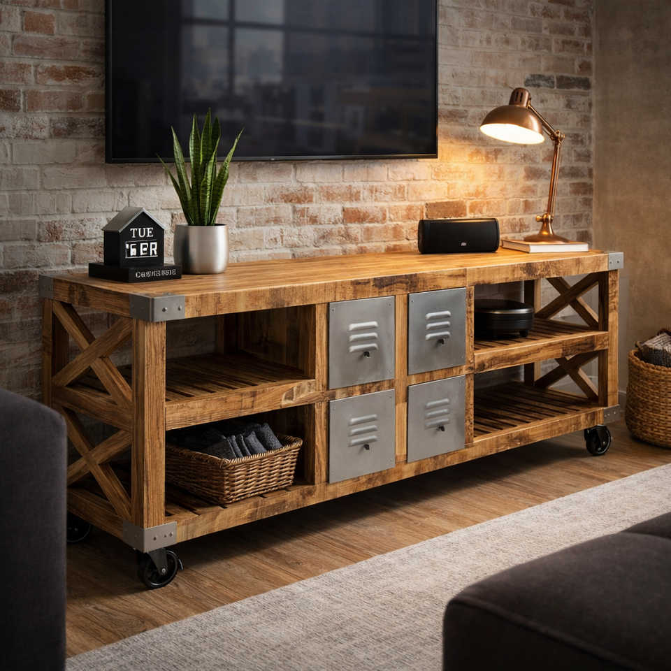 Handmade Solid Mango Wood TV Cabinet Industrial Style Storage Furniture for Home & Apartment Living Room