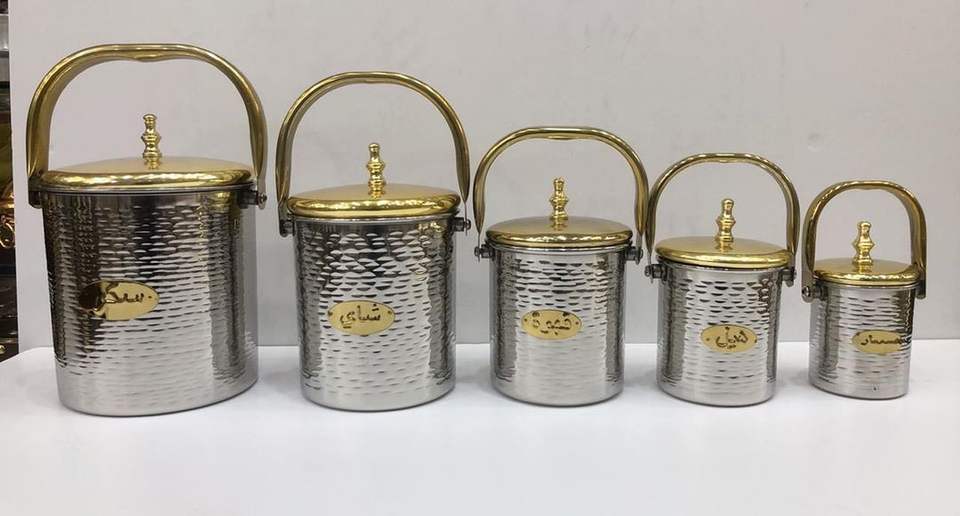 Handmade Stainless Steel Canister Set of 5 Gold Hammered Design with Custom Logo Food Storage & Container at Reasonable Price