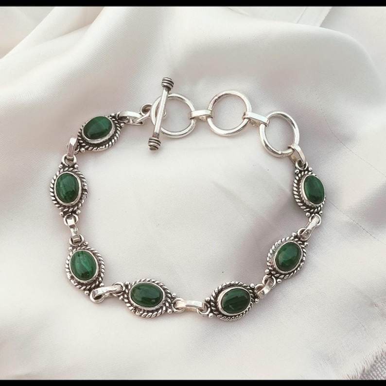 Handmade Sterling Silver Green Malachite Toggle Bracelet Natural Gemstone Jewelry Gift Women Men
