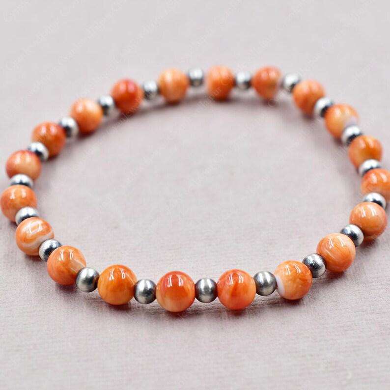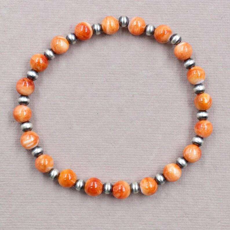 Handmade Sterling Silver Pearls & Orange Spiny Oyster Turquoise Stretch Bracelet