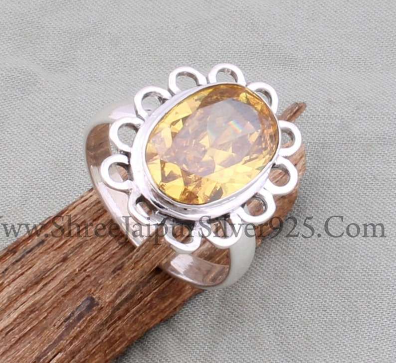 Handmade Sterling Silver Ring with Citrine and Cubic Zirconia Flower Design Gemstone Jewelry for Wedding Bezel Setting