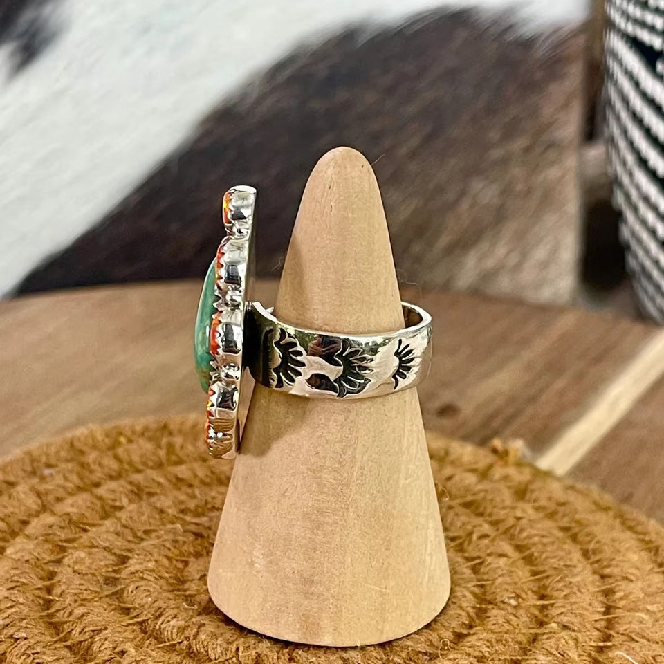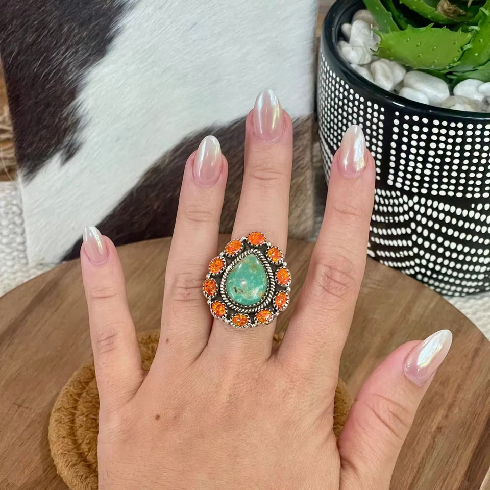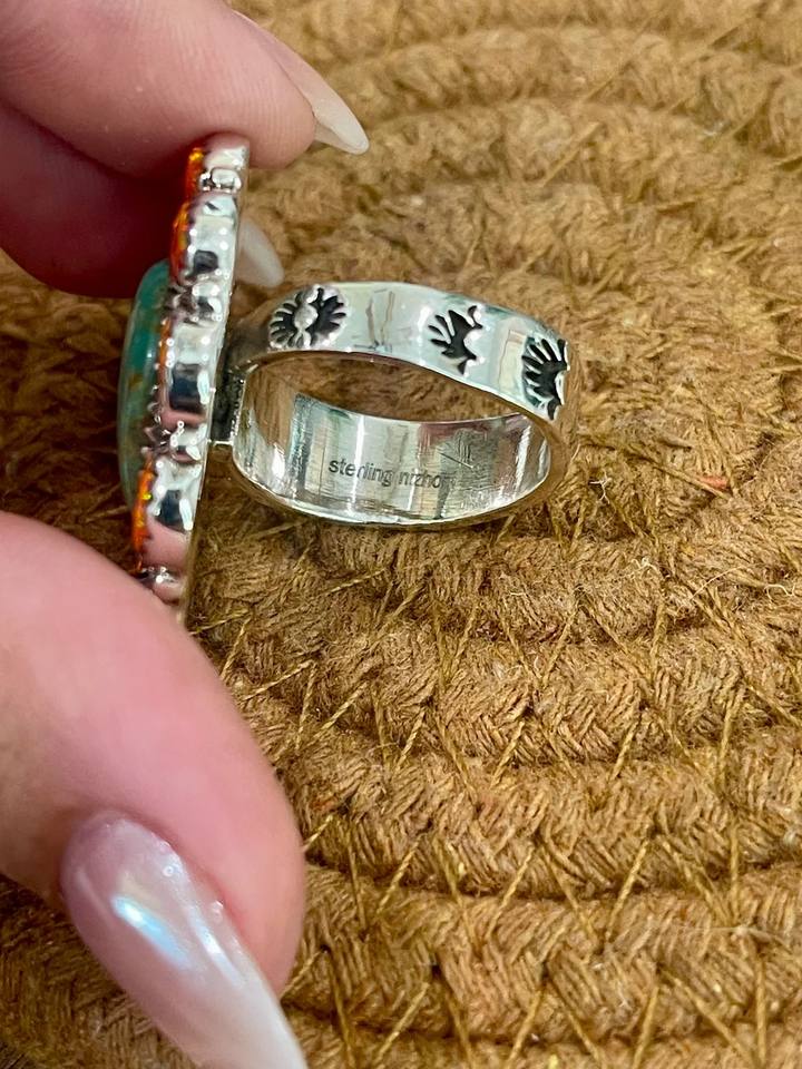 Handmade Sterling Silver Bezel Setting Royston Turquoise Orange Fire Opal Adjustable Gemstone Ring Trendy Unisex Party Wear