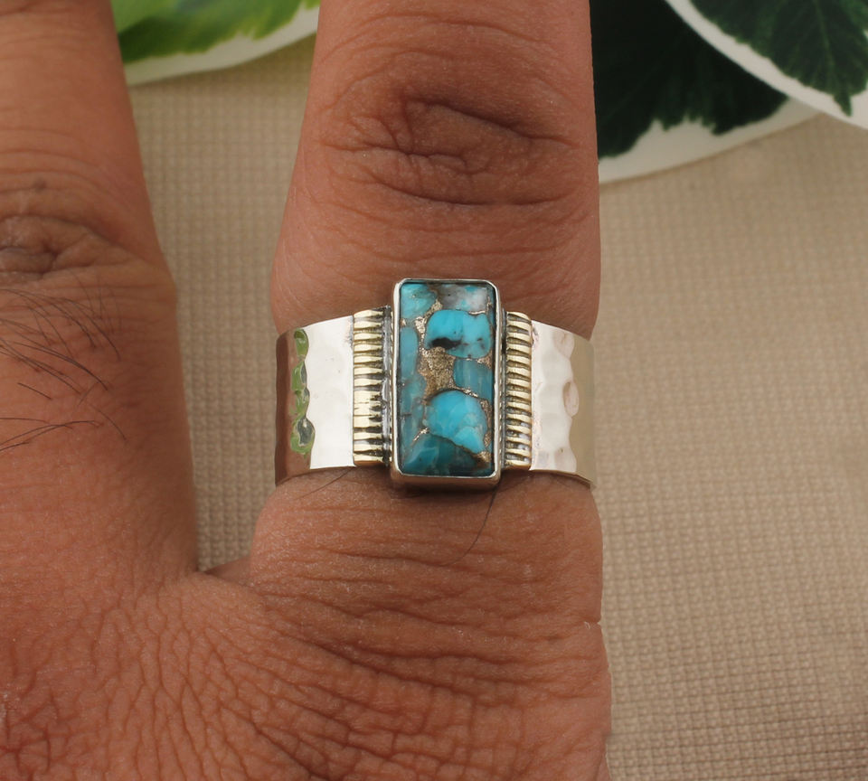 Handmade Sterling Silver Turquoise Inlay Ring Wide Band Rustic Statement Ring for Men & Women Southwestern Boho Jewelry