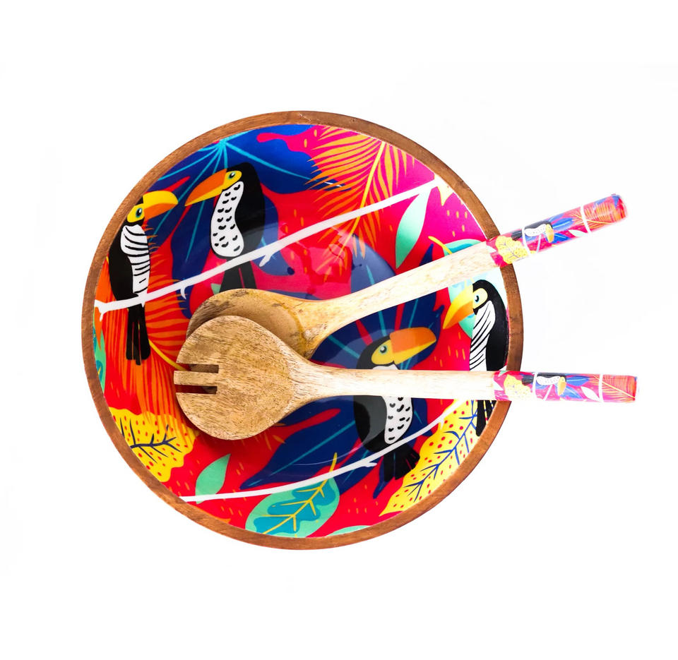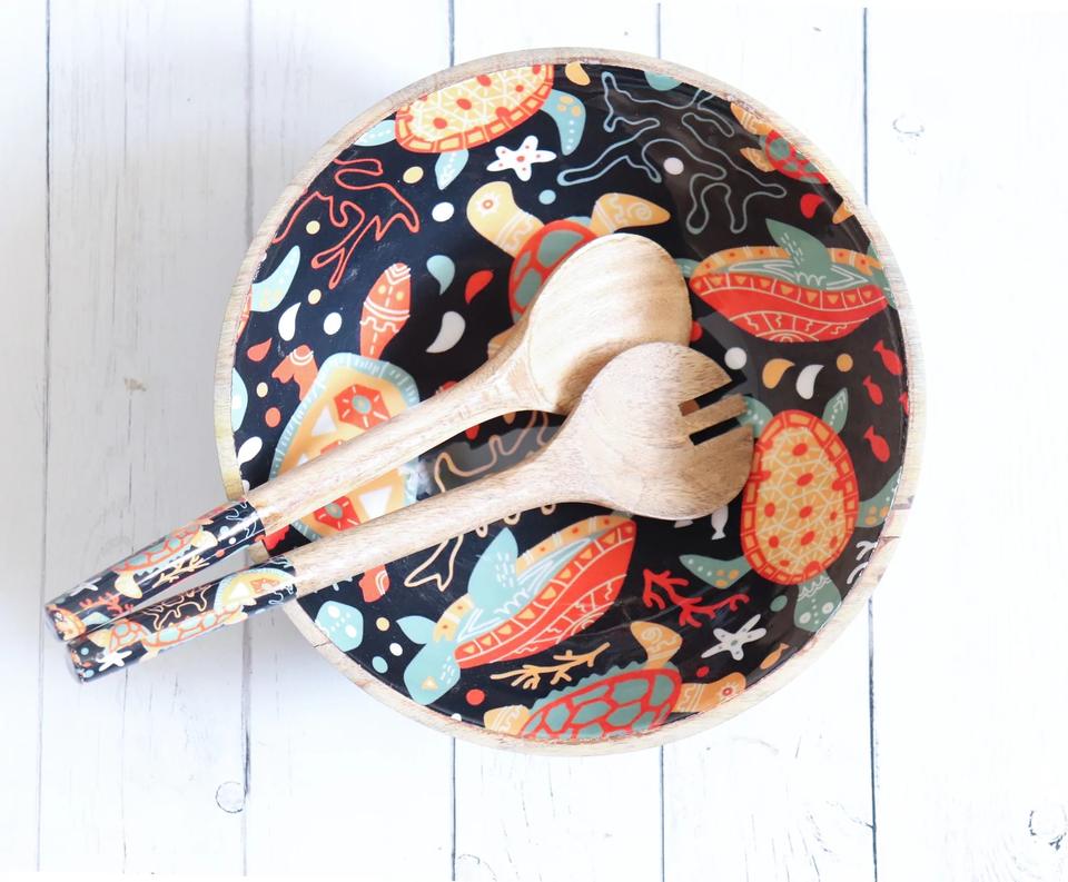Handmade Stunning Pattern Gift Set Large Wood Serving Bowl with Lid & Spoons Hummingbird-Natural Crafts From India.