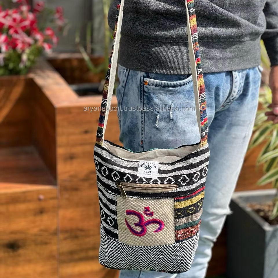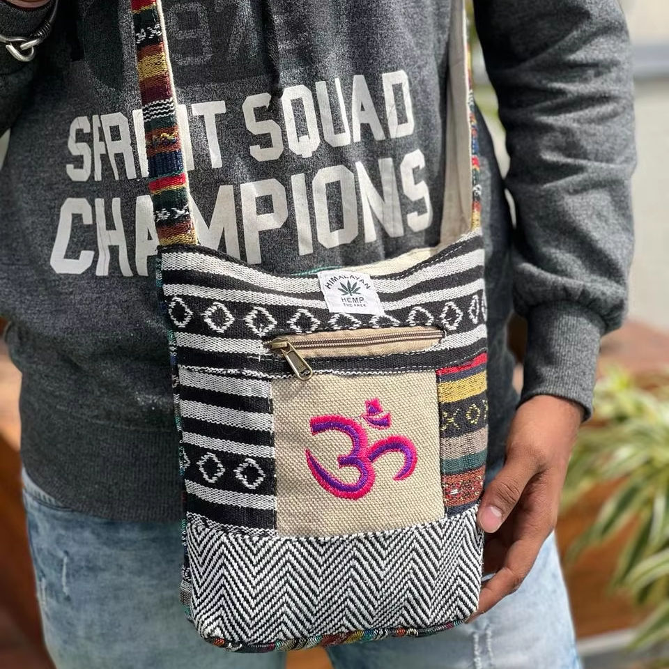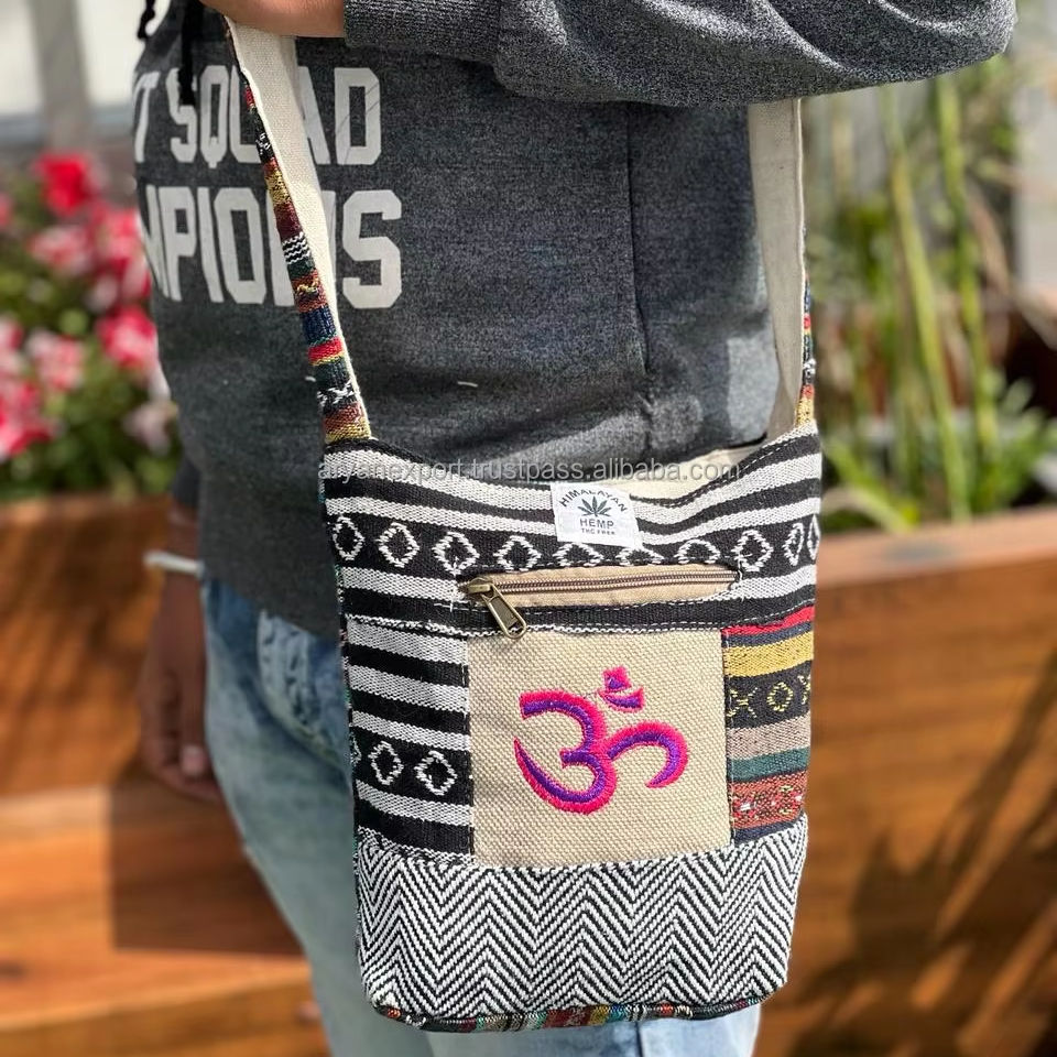 Himalayan Handmade Hemp Crossbody Bag with Embroidered Om Symbol Boho Designer Shoulder Sling Bag Eco-Friendly Festival Purse