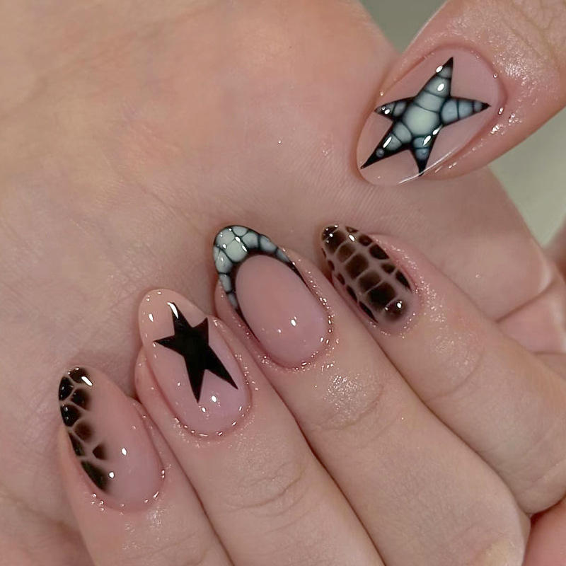 Handmade Summer Crocodile Pattern Dark Star Sweet Cool High-end Nude French Manicure Wearable Nails Short Style