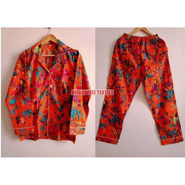 Handmade Cozy Cotton Satin Pajama Set Women Printed Bird Animal Linen Woven Thermal Hotels Sleepwear Long Night Suit Bamboo