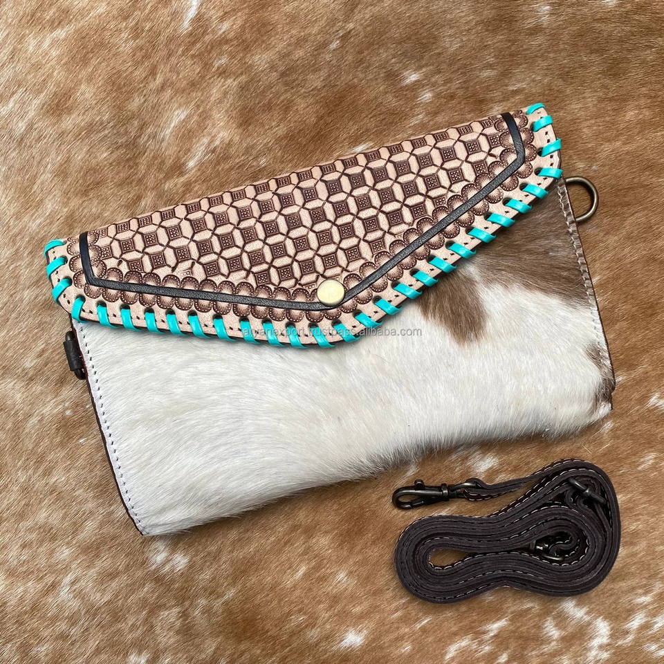 Handmade Tooled Leather Crossbody Wallet Purse for Women Western Hair on Cowhide Floral Card Holder Cell Phone Clutch for Travel