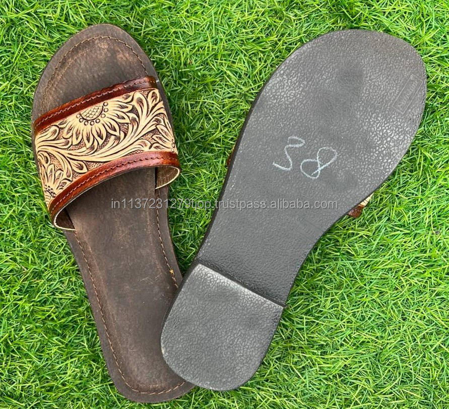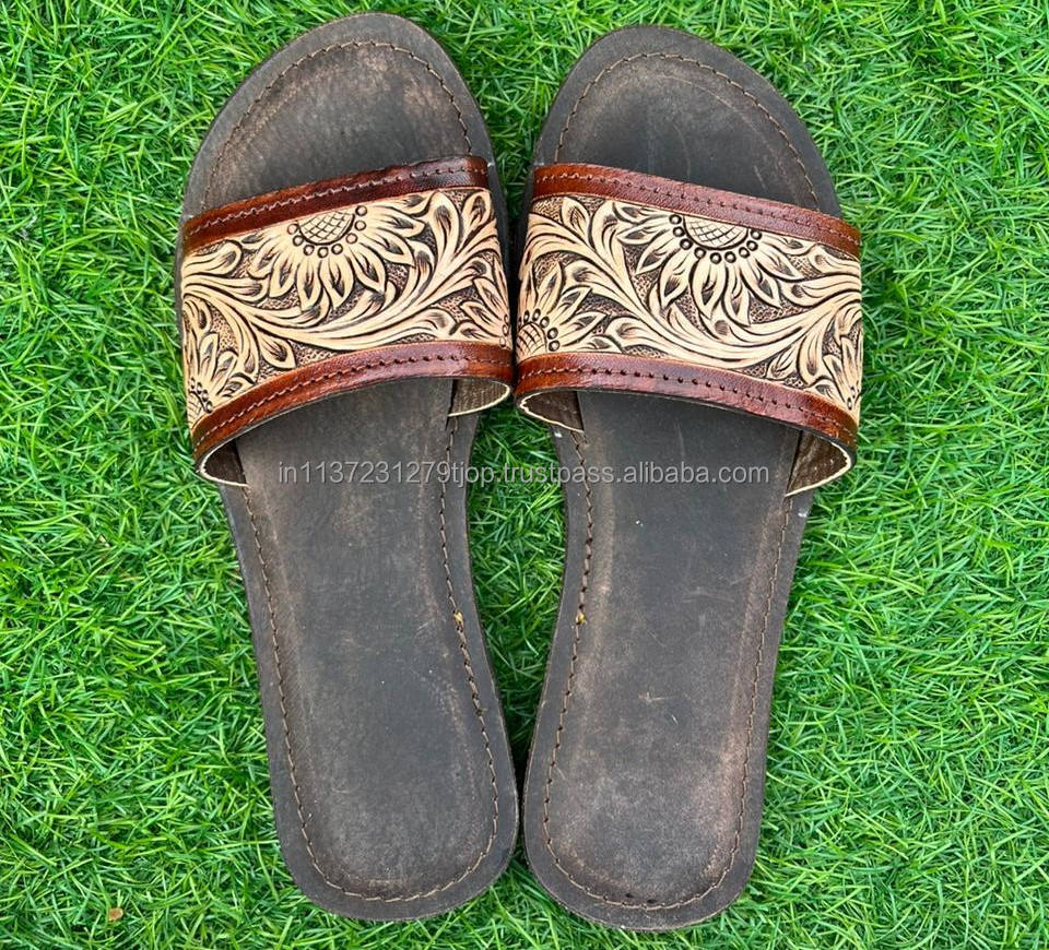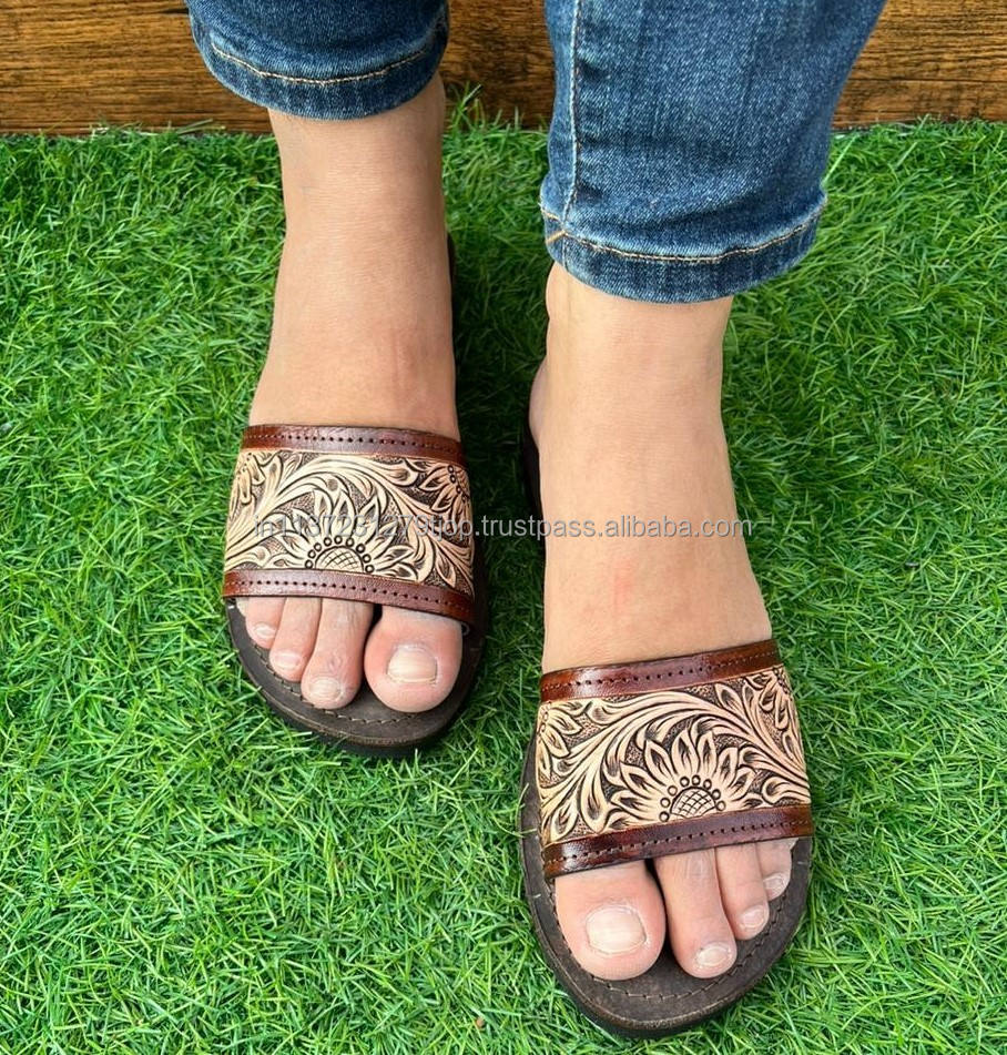 Handmade Tooled Leather Sandals Open Toe Bedroom Slides Western Natural Genuine Leather Women's Minimalist Flip Indoor Slippers