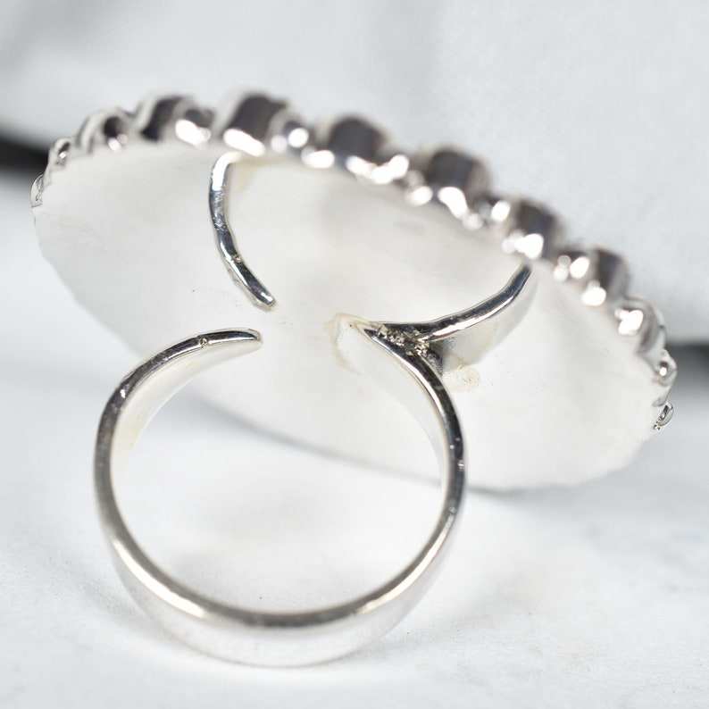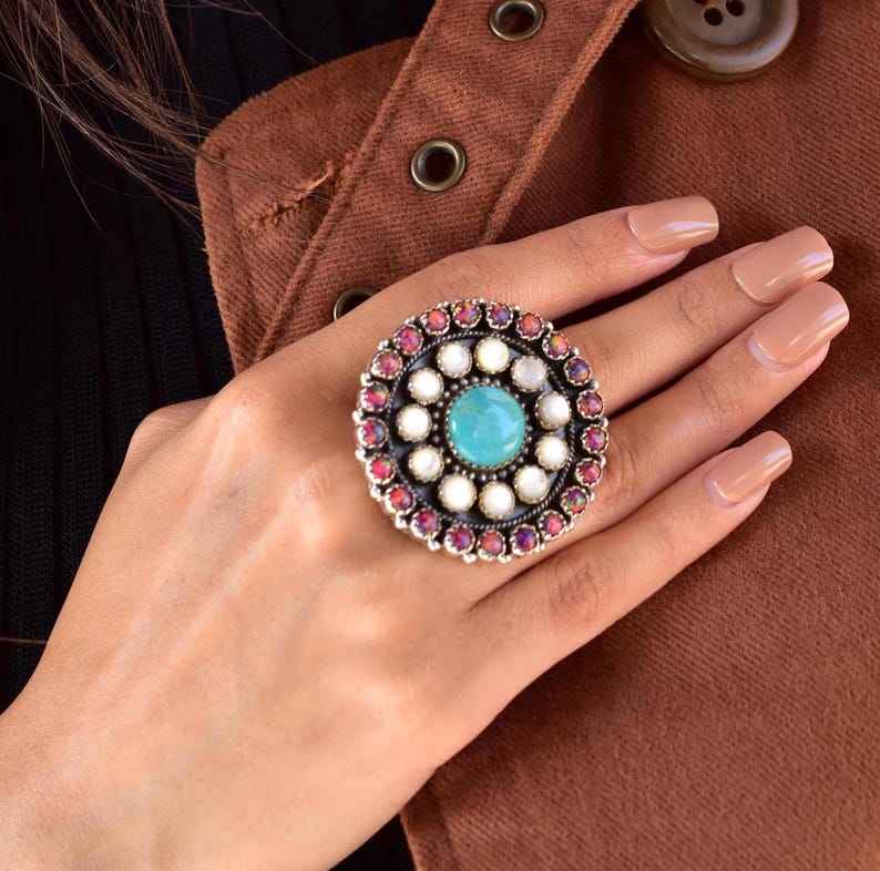 Handmade Turquoise Aurora Opal 925 Sterling Silver Adjustable Ring Pearl Statement Ring for Women