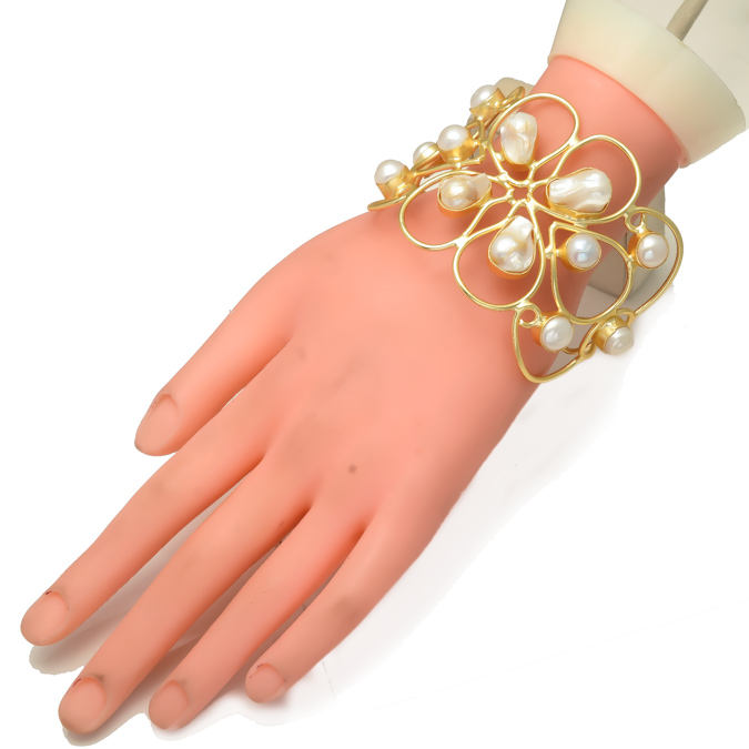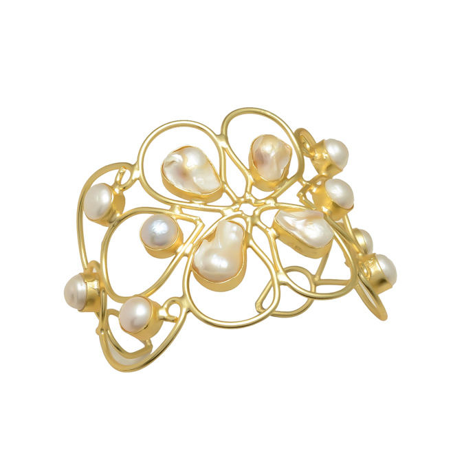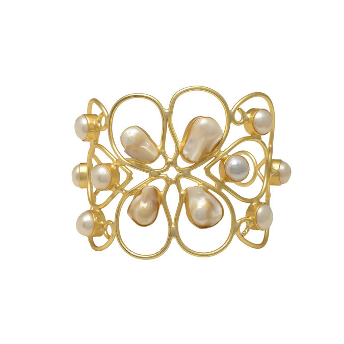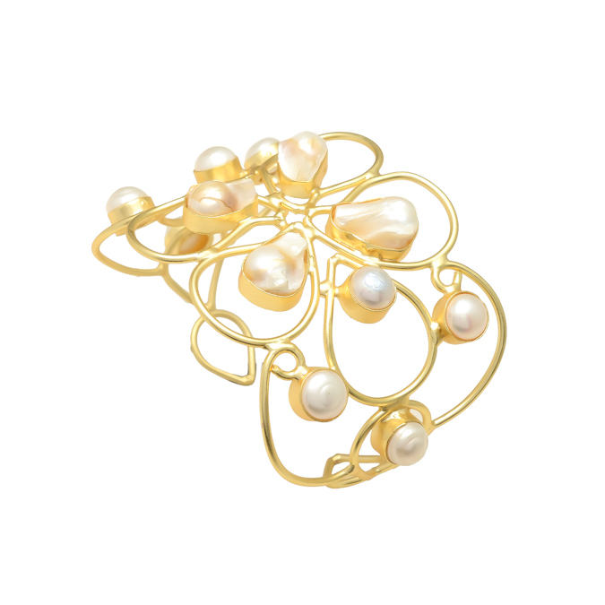 Handmade Uneven Shape Fresh Water Pearls Wire Twisted Beautiful Vintage 22 Ct Gold Plated Brass Adjustable Size Cuff Bracelet