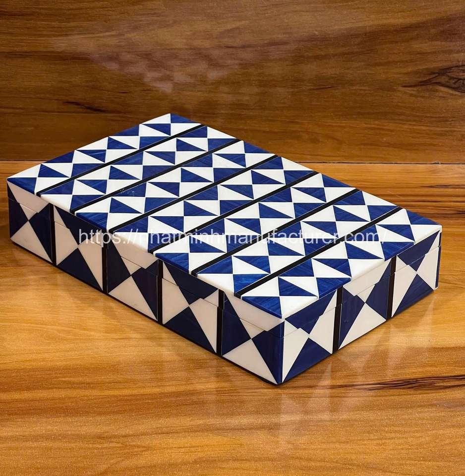 Handmade Unique Bone Inlay Lacquerware Jewelry Box Rectangular White and Blue Checkered for Home Table Decoration Souvenir