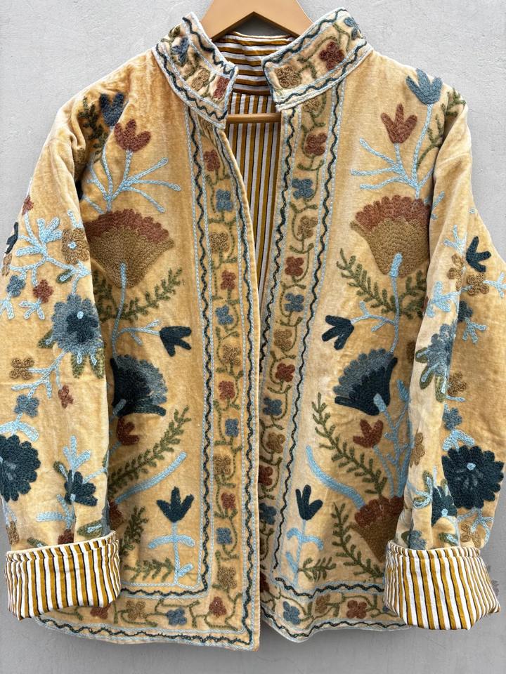 Handmade Velvet Suzani Winter Short Jacket Embroidery Short Jacket Mandarin Collar Warmed Jacket for Womens