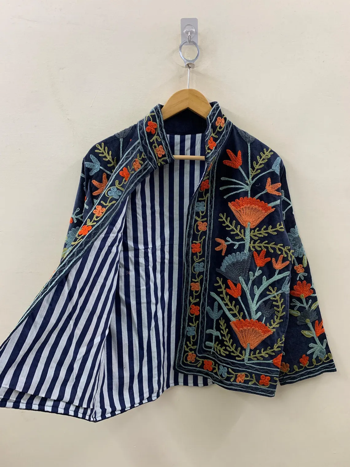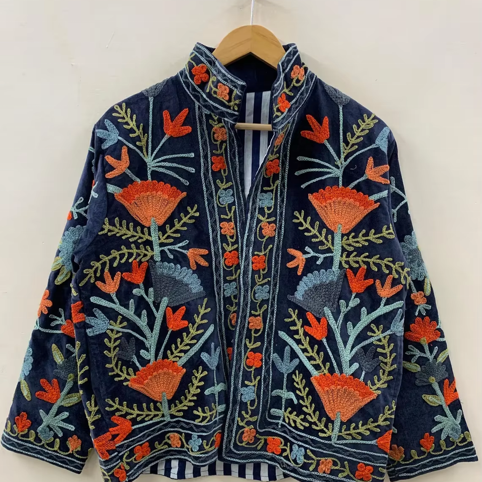 Handmade Velvet Vintage Suzani Embroidered Bomber Jacket Winter Warmed Coat with Breathable Feature Boho Style Short Jacket